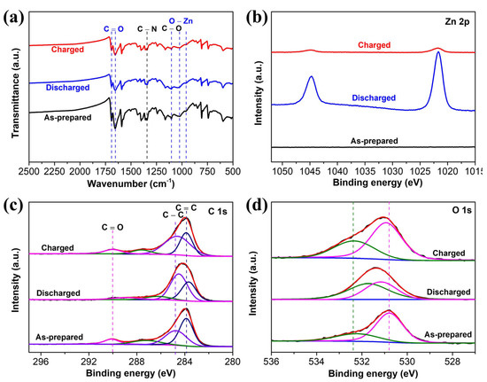 In order to shed light on the Zn2+ storage behavior of the PDI-EDA/EG-20 anode, ex-situ FTIR and XPS were performed. As shown in Figure 4a, in the FTIR spectra of the as-prepared sample, the dual adsorption peaks located at 1694.1 and 1659.6 cm−1 are assigned to the asymmetric and symmetric stretching vibrations of the C = O bond, respectively [9]. When the electrode is completely discharged, the adsorption peak at 1694.1 cm−1 will be weakened. Meanwhile, two new peaks positioned at 1102.5 and 1022.4 cm−1 appeared, which could be attributed to the stretching vibration of C-O and O-Zn bonds, manifesting the reduction of the C = O bond and the formation of the C-O-Zn bond [9,33]. When the electrode was completely charged, the adsorption peak at 1694.1 cm−1 was restored, while the new peaks at 1102.5 and 1022.4 cm−1 almost vanished, demonstrating that the redox reaction of the C = O bond and the uptake/release of Zn2+ are highly reversible [9]. In addition, the perylene ring and the C-N bond presented at 1588.6 and 1343.5 cm−1 barely changed during the whole discharge/charge process, indicating that these functional groups were not involved in Zn storage [40,41].