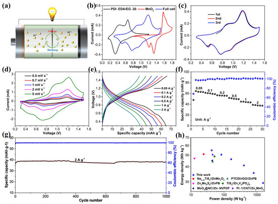 (a) Schematic of the fabricated ZIB device. (b) CV profiles of the PDI-EDA/EG-20 anode, the MnO2 cathode, and the ZIB full device. (c) Initial three CV profiles of the PDI-EDA/EG-20//ZnxMnO2 device. (d) CV profiles of the device at various sweep rates. (e) GCD profiles at different current densities. (f) Rate and (g) long-term cycling performance of the device. (h) Ragone plots of the ZIB in current work compared with previously reported ZIBs.