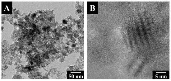 TEM images of Fe3O4 at (A) low and (B) high magnifications.