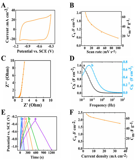 The electrode material prepared by method 1 was tested for its electrochemical performance in the potential range from −1.1 to −0.3 V. The testing results were plotted as shown in Figure 3. The CV graph in Figure 3A shows a nearly rectangular shape. The scan rate was increased from 2 to 100 mV s−1 and the capacitance was found to decrease (Figure 3B) from 2.42 to 0.55 F cm−2. The capacitance retention at a high scan rate of 100 mV s−1 (R100) was calculated to be 22.7%. The resistance of the electrode (Figure 3C), corresponding to the real part of Z*, was found to be 2.69 Ohms at a frequency of 10 mHz. The relatively low resistance achieved at 35 mg cm−2 mass loading indicated good conducting properties of the individual components. The C* dispersion of the relaxation type (Figure 3D) was observed and the relaxation frequency was 0.05 Hz, so a 20 s relaxation time constant could be calculated according to τ = 1/f from the C″ data. The charge and discharge curves were linear at 3–35 mA cm−2 current densities, showing good charge and discharge performance (Figure 3E). The capacitance was calculated as 2.42 F cm−2 at 3 mA cm−2 current density and decreased to 1.75 F cm−2 when the current density increased to 35 mA cm−2, as shown in Figure 3F.