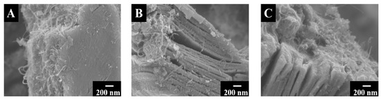 SEM images of (A) 60Ti3C2Tx–30Fe3O4–10MCNT, (B) 55Ti3C2Tx–30Fe3O4–15MCNT and (C) 55Ti3C2Tx–25Fe3O4–20MCNT powders prepared by method 2.