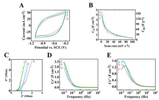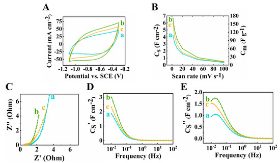 (A) Cyclic voltammetry at 10 mV s−1 scan rate, (B) capacitance from CV data, (C) Nyquist plot, (D,E) complex capacitance components (D) Cs’ and (E) Cs’’ of 60Ti3C2Tx–30Fe3O4–10MCNT electrodes at (a) 30, (b) 40 and (c) 45 mg cm−2 active mass loading electrodes prepared by method 2.
