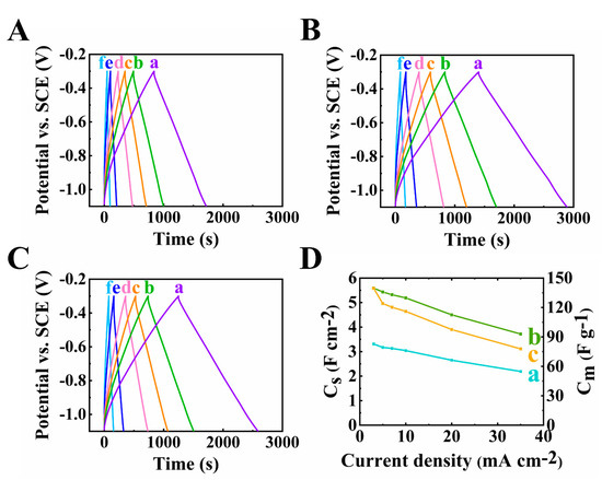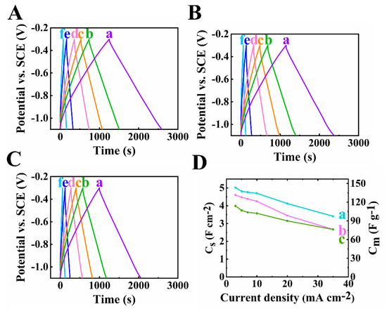 The GCD results shown in Figure 6A and Figure 8 are consistent with the CV and EIS data. Good pseudocapacitive performance was proven by the triangular-shaped curves. The longest discharge time was obtained for the electrode at 40 mg cm−2 mass loading, which is the result of its highest capacitance.