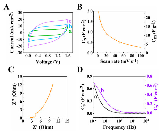 The as-fabricated asymmetric supercapacitor was tested in an enlarged voltage window of 1.6 V. An areal capacitance as high as 1.96 F cm−2 was obtained at a 2 mV s−1 scan rate from the CV (Figure 11A,B) and 1.49 F cm−2 was obtained at 10 mA cm−2 current density from the GCD (Figure 12A,B). The total resistance for the device at high active mass loading (Figure 11C) depended on the resistances, related to the ion diffusion in the pores of both the electrodes and a membrane. The Cs′ value was obtained as 0.77 F cm−2 at the frequency of 0.01 Hz (Figure 11D).