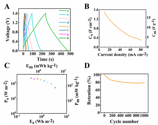 (A) Galvanostatic charge–discharge results at (a–h) 10, 20, 30, 40, 50, 60, 70 and 80 mA cm−2 current densities, (B) capacitance calculated from GCD data, (C) Ragone plot derived from GCD data(corresponding to curve h-a in Figure 12A from left to right dots) and (D) capacitance retention of the asymmetric device.
