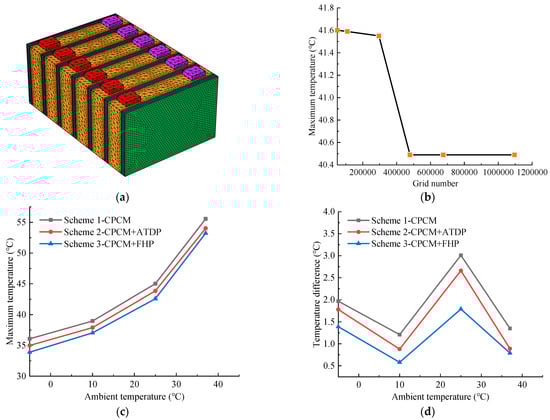 Mesh of Scheme 3 (a), independence analysis of grid in Scheme 3 under 1C discharge rate and 25 °C ambient temperature and natural convection (b), and comparisons of maximum battery temperatures (c) and temperature differences (d) in Scheme 1, Scheme 2, and Scheme 3 with 12 FHPs under a 2C discharge rate and ambient temperatures of −5 °C, 10 °C, 25 °C, and 37 °C.