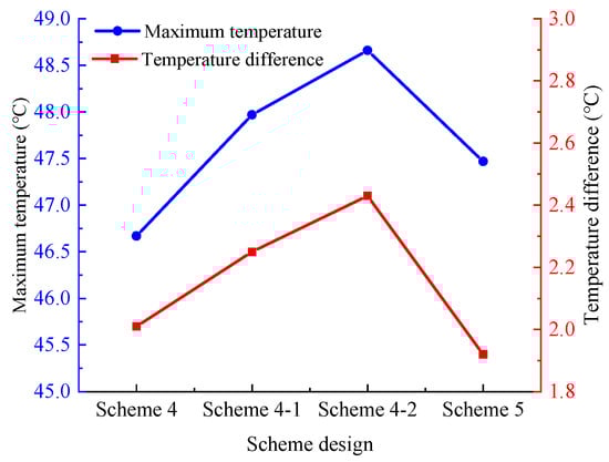 Maximum temperature and temperature difference in the battery module of different schemes under 2C discharge rate and 37 °C ambient temperature.