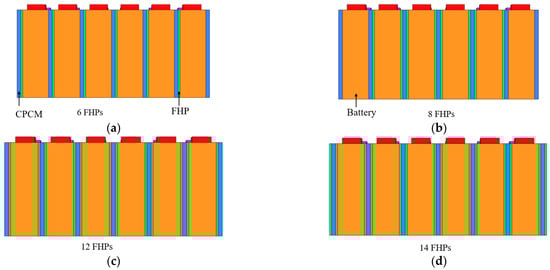 The FHPs are applied between batteries in the BTMS based on CPCM to improve thermal performance. Therefore, the FHP number is set to 6, 8, 12, and 14, respectively, shown in Figure 5, to improve the temperature uniformity of the BTMS. Six FHPs are decorated in Figure 5a, attached to one side of the six batteries. Eight FHPs are set in Figure 5b, which are placed on both sides of the four middle batteries to strengthen the cooling capacity of the battery module. Twelve FHPs are employed in Figure 5c on both sides of the six batteries. Moreover, Figure 5d is a combination of Figure 5c and two FHPs on the two outsides of the battery module.