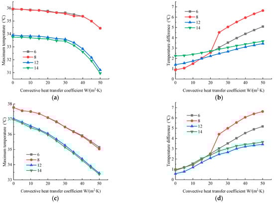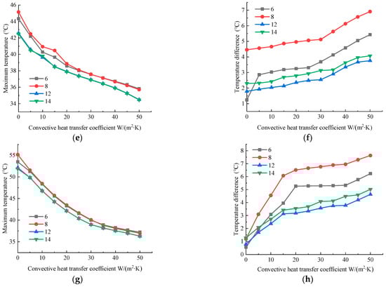 In addition, it can be seen from Figure 6b,d,f,h that the maximum temperature of the battery module decreases with the convective heat transfer coefficient increasing while the temperature difference increases. Furthermore, the temperature difference of the battery module is significantly impacted by the convective heat transfer coefficient, especially when the FHP number is set to be 6 and 8, and it is decreased when the number of FHPs increases to 12 and 14 because of the higher thermal conductivity of the FHPs. It is indicated that the FHPs can effectively reduce the maximum temperature while significantly improving the temperature uniformity of the BTMS.