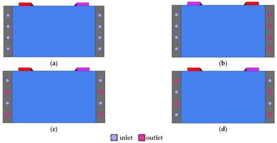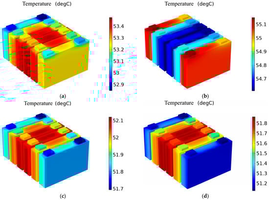 Figure 10 shows the structure diagram of Scheme 4 in Figure 1d with four coolant flow directions under the 2C discharge rate, 37 °C ambient temperature, and 0.1 m/s coolant velocity. Figure 10a shows the directions of eight cooling pipes set as parallel flow, namely, Case 1; Figure 10b shows the four cooling pipes on one side as inlets while the four cooling pipes on the other side are outlets, namely, Case 2; Figure 10c is the directions of the four cooling pipes on one side as the counter flow and four cooling pipes on the other side in the horizontal direction, namely, Case 3; Figure 10d is the directions of eight cooling pipes, all as counter flow, namely, Case 4. The difference between Case 3 and Case 4 is that the coolant flow direction on both sides of the horizontal direction is consistent in Case 3 while it is different in Case 4.