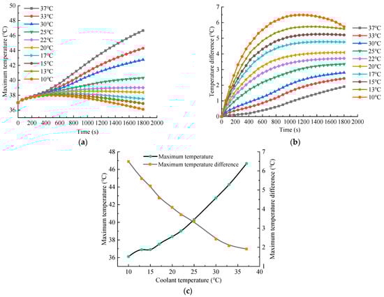 Figure 8a shows that the maximum temperature of the battery module will be affected by the coolant temperature, and the two are positively correlated. Still, the temperature difference has an opposite trend. The maximum temperature reaches 46.67 °C, 6.56 °C lower than that of the BTMS, based on the coupling of CPCM and the FHPs under the coolant temperature of 37 °C, showing that liquid cooling has a good effect on improving the heat dissipation performance of the BTMS. Liquid cooling takes away more and more heat as the coolant temperature decreases. Moreover, the rate of decline is relatively large until the coolant temperature drops to 22 °C. It shows that the heat taken away by the coolant has reached a balance with the heat generated by the battery module. Even if the coolant temperature continues to be lowered, it cannot cool down more effectively. Currently, the maximum temperature of the battery module remains near the initial ambient temperature. In addition, it remains near the phase change temperature of CPCM at 13 °C and 15 °C coolant temperatures due to the melting of the CPCM.