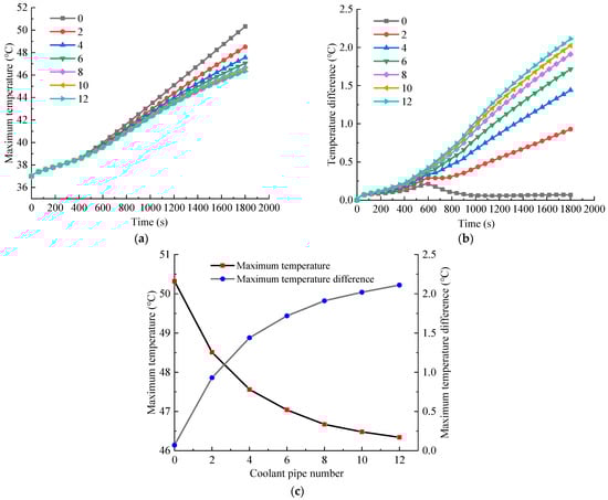 Figure 9 shows the change in battery temperature with the number of cooling pipes being 0, 2, 4, 6, 8, 10, and 12 under a 2C discharge rate, 37 °C ambient temperature, and a coolant velocity of 0.1 m/s. The maximum temperature of the battery module decreases with the larger number of cooling pipes. It reaches up to 50.32 °C without liquid cooling, which exceeds the working temperature of the BTMS. Furthermore, it continues to decrease with the increasing number of cooling pipes. The main reason is that more cooling pipes can take more battery heat.