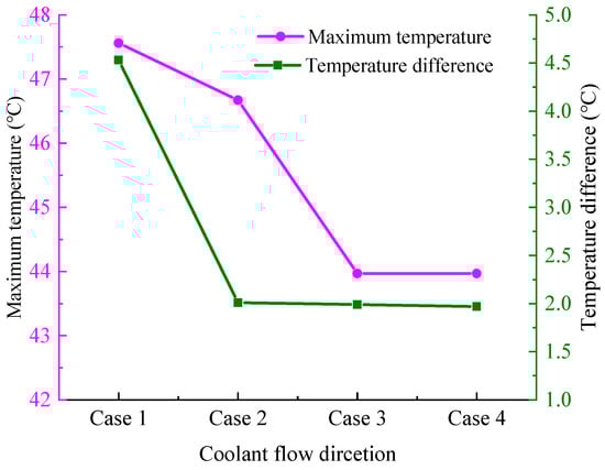 Maximum battery temperature and temperature difference of Scheme 4 in four cases of coolant flow direction, as shown in Figure 10.