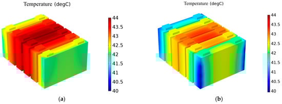 Temperature fields of the battery module in the original scheme (A3B4C2) (a) and A1B4C4 (b) under a 2C discharge rate and 37 °C ambient temperature.