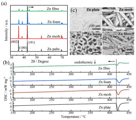 (a) X-ray diffraction patterns, (b) differential scanning calorimeter spectra analysis, and (c) SEM images of different zinc materials.