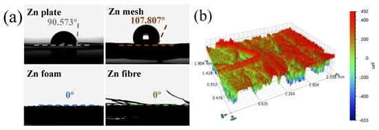Given the significant impact of the electrode–electrolyte interface on the electrode reaction processes of hybrid-flow batteries, the hydrophilicity of these zinc anodes was investigated using a contact angle tester [,,]. The results presented in Figure 3a showed that zinc fiber had a low contact angle and a high affinity for water, promoting the electrodeposition and dissolution of zinc at the electrode–electrolyte interface during the charge–discharge processes. The optical images showed that the zinc mesh, zinc foam, and zinc fiber had varying degrees of porosity, with the zinc fiber having the most prominent porous structure (Figure S4). This structure increases the specific surface area of the zinc electrode material, expands the reactive area of the zinc negative electrode, and decreases the overpotential. Furthermore, a three-dimensional contour scan of the zinc fiber (Figure 3b) revealed that the surface of the zinc fiber was undulating and had a well-developed pore structure (with altitude intercepts up to 1145 μm) [,]. These structural analyses demonstrate that the porous zinc electrode, particularly the zinc fiber (zinc mesh, zinc foam, and zinc fiber), has an optimized electrode structure.