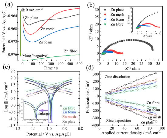 Electrochemical property analyses for all zinc materials (the black, red, blue and green lines present plate, mesh, foam and fibre, respectively). (a) The open-circuit potential, (b) the Nyquist plot, (c) the Tafel plot, and (d) the polarization potential at different current densities.