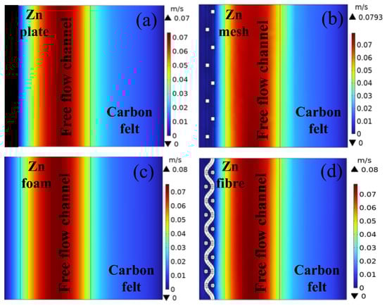 Velocity fields of a multiphysics model for full batteries equipped with zinc plate (a), zinc mesh (b), zinc foam(c) and zinc fibre (d) electrodes after 15 min charging (front view of cells).