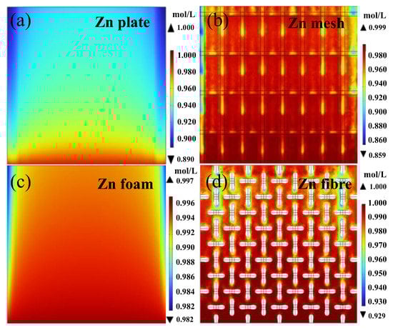 Concentration distribution of Zn2+ at the interfaces between zinc anodes and electrolyte solutions after 15 min charging (left view of cells): (a) zinc plate, (b) zinc mesh, (c) zinc foam and (d) zinc fibre.