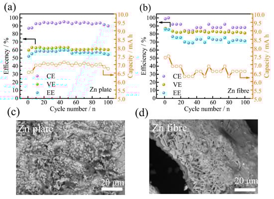 Comparison of the system efficiencies and capacities of the full batteries equipped with zinc plate (a) and zinc fiber anodes (b) at 30 mA cm−2; the surface morphology of the zinc plate anode (c) and zinc fiber anode (d) after 100 cycles of charging–discharging.