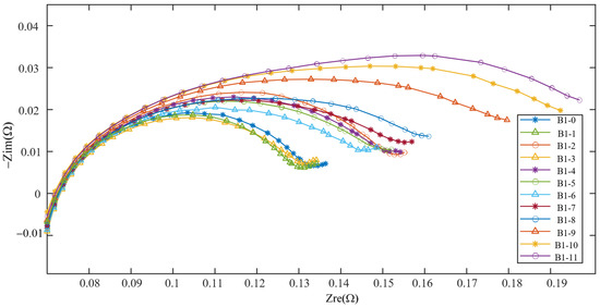 Figure 3 illustrates the changes in impedance spectrum with aging. Since the variation trends of impedance spectrum of B1 and B2 are very similar, only the impedance spectrum of B1 are shown here for the convenience of drawing. The 11 impedance spectrum measurements for B1 acquired over Stage II are labeled as B1-0, B1-2, …, B1-11, as shown in the figure. To aid visualization of how the trend of impedance spectrum changes with aging degree, the impedance spectrum at different aging stages is translated horizontally so that the intersections of the Nyquist plots with the real axis are adjusted at 70 m. The figure shows that the impedance spectrum tomography of the battery exhibits a generally monotonic expansion pattern, which evidences its strong relationship with the degree of battery aging [22].