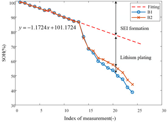 where T is the absolute temperature, with a unit of K; k corresponds to the rate of chemical reaction at temperature T; R is the molar gas constant, J/(mol·k); is the experimental activation energy, generally regarded as a constant independent of temperature; and C is a constant. As can be seen from Equation (1), the reaction rate of SEI formation k, with all else being constant, is only a function of temperature. Nonetheless, in the conducted experiments, the temperature is also kept constant at 25 °C, resulting in a constant k. Clearly then, one should observe a quasi-linear downward trend in SoH as the cycle number increases, and a straight line may be fitted to the experimental data, see the dashed red line in Figure 4; since there are two batteries (B1 and B2) involved, their SoH data over Stage I are averaged before fitting. With the acquired linear fit, one can extrapolate it to subsequent cycles in which lithium plating occurs; then, the difference between the actual curve and extrapolated fitted line ought to be attributed to the capacity loss caused by lithium plating, as shown in Figure 4 [25]. To this stage, the effects on capacity loss due to SEI formation and lithium plating have been successfully decoupled.