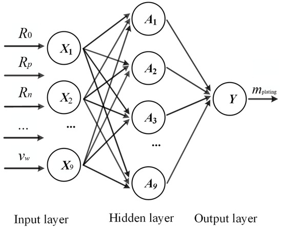 BPNN is trained with the back-propagation algorithm, which is one that minimizes the mean square error between the actual output value and the expected output value by using gradient descent. The network takes an elementary form such that it consists of an input layer, a hidden layer, and an output layer, as shown in Figure 8, which represents the typical setup of a “shallow” network, as opposed to the more complex deep neural network (given the current data amount, the use of any network with more than one hidden layer can hardly be justified). The neurons in adjacent layers are fully connected, and the weights account for the connection strength [28]. The mathematical expression for the output of the hidden layer is well known and can be expressed as: