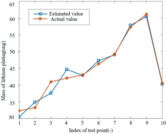Recall that for each of B1 and B2, 11 impedance spectrum are acquired, which implies that there are a total of 22 sets of feature–target pairs available for training and testing the ANN. Twelve groups of data are randomly selected for training, and the remaining ones are used for testing. Without loss of generality, “tansig” is selected as hidden layer transfer function , while “purelin” is selected as output transfer function . When tuning for the number of neurons in the hidden layer, a grid search is thought apt, and the choice finalizes at nine, as it delivers the best performance of the algorithm over the testing set. The test results corresponding to this final choice are shown in Figure 9. It can be seen from the figure that the ANN performs well in estimating the mass of lithium plating of the battery, with a maximum relative error of 8.31% and an average relative error of 3.08%. The error mainly comes from the small number of layers and simple structure of the model. However, the focus of this paper is to propose a complete strategy to quantify the lithium plating, which can improve accuracy in the future by using more sophisticated algorithms.