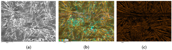 SEM/EDS results of B4 (moderate lithium plating). (a) is the SEM scanning result, (b) is the EDS scanning result and (c) is the oxygen distribution on electrodes.