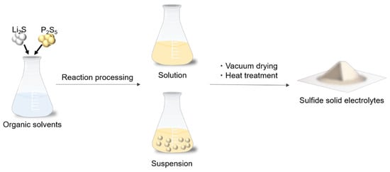 In the liquid-phase synthesis, sulfide SEs are generally synthesized through a chemical reaction in solvents, solvent removal, and the crystallization process. This synthesis method is classified into suspension and solution synthesis, depending on the state of the solution in the reaction process, as shown in Figure 1. The state during the reaction process is determined by the properties of the solvent.