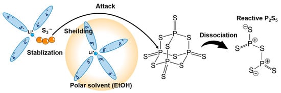 As mentioned above, the wet-chemical synthesis of lithium thiophosphates initiates the dissociation reaction of P4S10. The dissociation reaction is driven by nucleophilic attack from lone-pair electrons of Li2S and/or donor solvents [26,29]. The introduction of reactant agents for activating P4S10 is a useful strategy for the rapid synthesis of sulfide SEs. The addition of lithium thioethoxide and lithium halide facilitates the formation of soluble chemical species [64,68,69]. Halide ions are nucleophilic, and quickly dissociate P2S5 in organic solvents, as shown in Figure 6e [64]. Lithium ions are strongly solvated by donor solvents owing to their strong Lewis acid. Therefore, the bond of Li ions with counter ions is strongly polarized and more easily dissociated. In the coordination environment, where the cation is highly stabilized, the anion species would be available as reactive chemical species in the system. Taking this into consideration, the reaction mechanism in the wet-chemical synthesis of Li7P2S8I SEs may intrinsically differ from that of Li3PS4 [23,24].