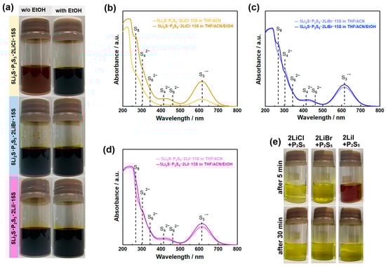 (a) Optical images of 5Li2S P2S5 15S (molar ratio) and 5Li2S P2S5 2LiX 15S (X = Cl, Br, and I) at 0.1 mol L−1 in ACN/THF and ACN/THF/EtOH solvents. UV-Vis spectra of (b) 5Li2S P2S5 2LiCl 15S, (c) 5Li2S P2S5 2LiBr 15S, and (d) 5Li2S P2S5 2LiI 15S solutions at 0.5 mmol L−1 in ACN/THF and ACN/THF/EtOH solvents. (e) Optical images of 2LiCl·P2S5, 2LiCl·P2S5, and 2LiCl·P2S5 in THF/ACN solvent (0.1 mol L−1) from the standing samples for 5 and 30 min. Reprint with permission [63]: Copyright 2023, American Chemical Society.
