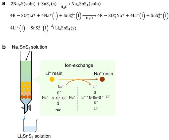 Li4SnS4 was synthesized from Na4SnS4 using the ion-exchange method via water [70]. Firstly, an Na4SnS4 solution was prepared through the reaction between Na2S and SnS2 in water. The obtained Na4SnS4 solution flowed through a column packed with Li-type ion exchange resin to exchange from Na+ to Li+ ions in Na4SnS4. The resultant Li4SnS4 aqueous solution was dried and heated to obtain Li4SnS4 SEs (see Figure 7). The Li4SnS4 obtained from this method showed an ionic conductivity of approximately 1 × 10−4 S cm−1 at room temperature, which is the same value as Li4SnS4 prepared by the solid-phase method and mechanochemical reaction. Unlike Li2S, Na2S can be handled in air, and it is easy to process the reaction in an aqueous solution. This method using inexpensive Na2S and H2O as reaction solvents resolves environmental loads owing to the use of organic solvents and economic concerns.