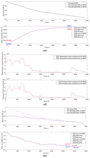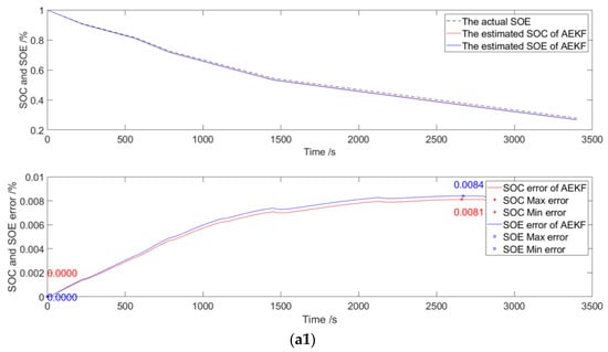 As shown in Figure 7(a1–c1), the top and bottom graphs are adaptive and error curves, respectively. According to Table 2 and Figure 7, the SOE error ranges from −1.09% to 1.16%, and the SOC error ranges from −1.06% to 1.19%. As the EULIB enters the end of the stage of step echelon use, the estimation errors of the SOC and SOE increase further.