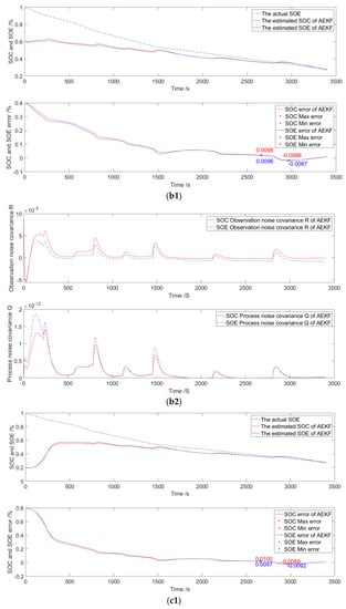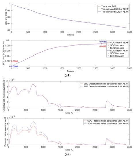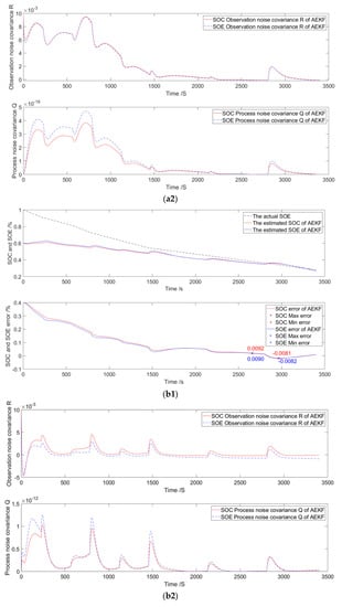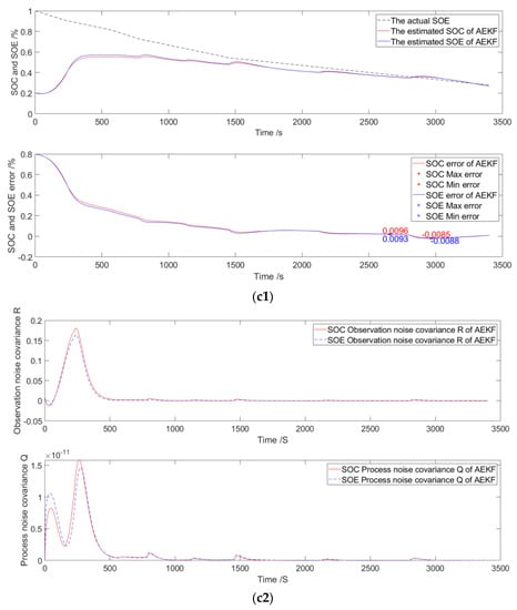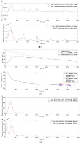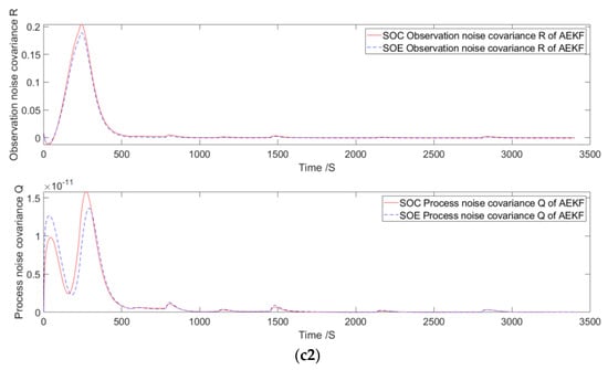 As shown in Figure 5(a2–c2), the top and bottom graphs are observation noise covariance (ONC) and process noise covariance (PNC) curves, respectively. During the first 1500 s period, the curves fluctuate greatly, which is an adaptive adjustment. After the second 1500S period, the fluctuation tends to be stable, and the error gradually approaches zero. The curves show that the method is convergent. With the increase in the error between the initial and true values of the SOE or SOC, the covariance of both the observed value and the process noise increases. Even if the initial value is different, the actual value can be tracked eventually through the adjustment of the algorithm.