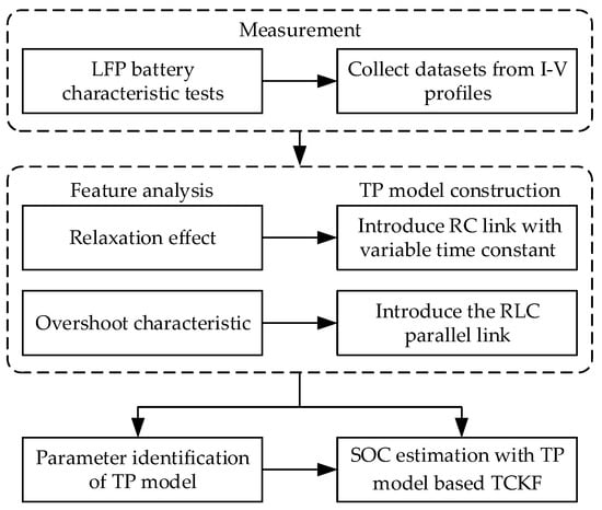 By taking the long relaxation time and overshoot of the polarization voltage of an LFP battery into account, an improved equivalent circuit model is proposed in this paper based on the second-order RC hysteresis model, i.e., the triple polarization model. The TP model reflects the fast build-up and slow relaxation of the polarization voltage by adding an RC link with a variable time constant, and it reflects the overshoot characteristic by replacing the RC link with an RLC parallel link during charging. In this way, the external characteristics of LFP batteries, considering the complex phase transition process, are simulated by a simple equivalent circuit. Compared with traditional ECMs, the TP model has a higher accuracy in voltage simulation and is able to decrease the estimation error in SOC estimation. This paper is organized as follows: Section 2 introduces the theory of the TP model, Section 3 introduces the parameter identification of the TP model, Section 4 introduces the TCKF algorithm to estimate the SOC, and Section 5 verifies the superiority of the proposed model and algorithm via experimentation. Figure 1 is the flowchart of the TP model construction.