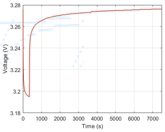 Polarization voltage relaxation is a process in which the terminal voltage slowly converges to the equilibrium voltage after charging or discharging. The relaxation time of an LFP battery is usually longer than 2 h. The possible reason for this is that, for lithium iron phosphate materials, particles in the two-phase region may exchange lithium ions during relaxation to reach an equilibrium two-phase system of Li-rich and Li-poor stripes, which takes a long time [,]. Figure 2 shows the voltage curve of a 120 Ah LFP battery discharging for a 5% capacity with a 0.5 C constant current and then rested for 2 h under open-circuit conditions. As Figure 2 shows, the OCV does not reach a steady state, even after resting for 1h. This indicates that there is a large time constant component at resting, while, during the build-up process of the polarization voltage, the corresponding time constant component is small.