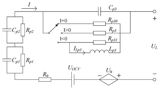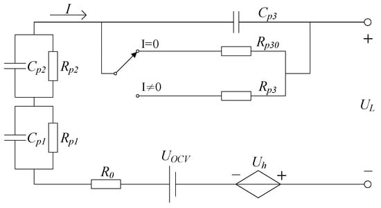 In order to reflect the fast build-up and slow relaxation of partial polarization voltage, this paper introduces an RC link whose time constant varies with changes in the battery operating status on the basis of the second-order RC hysteresis model. Figure 3 shows the modified ECM with the addition of a variable time constant RC link, which changes the time constant by switching between the resistors  and .