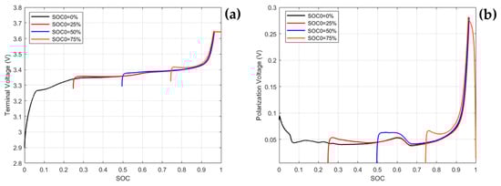 Figure 4 shows the comparison of the polarization voltage variation for different initial SOCs in the step charging of a 120 Ah LFP battery. The polarization voltage in Figure 4b is obtained by subtracting the corresponding open circuit voltage from the terminal voltage. The charging currents are set to 0.5 C and the battery is rested for 3 h under open-circuit conditions before charging. This experimental procedure refers to []. From Figure 4, the following two phenomena can be observed: (1) the polarization voltage curves of the different initial SOCs almost overlap after reaching a steady state, indicating that the polarization voltage steady state values are the same with different initial SOCs; and (2) the excess portions of the polarization voltage with SOCs of 25%, 50%, and 75% beyond the value with an SOC of 0% are different, indicating that the dynamic overshoot values are different with different initial SOCs.