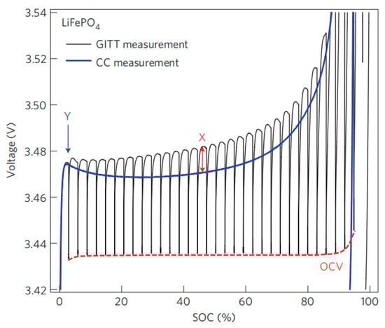 It is found that an exceptional polarization overshooting is also observed in the GITT tests, as is shown in Figure 5 []. Sasaki et al. [] thought that the marked Y in Figure 5, standing for the initial overshoot, should be caused by a kinetics effect, while the marked X, standing for the overshooting after relaxation, can be explained by a many-particle model and the non-uniform chemical potential of LFP.