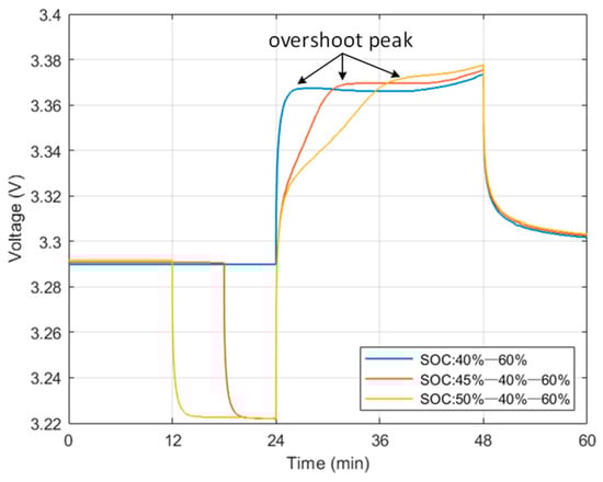 Figure 7 shows the comparison of the terminal voltages of one LFP battery charging/discharging using three different strategies. For the first test, the initial SOC is 40% after a 3 h rest, charging the cell to a 60% SOC directly; for the second test, the initial SOC is 45% after a 3 h rest, discharging the cell to a 40% SOC, and then charging the cell to a 60% SOC without rest; and for the third test, the initial SOC is 50% after a 3 h rest, discharging the cell to a 40% SOC, and then charging the cell to a 60% SOC without rest. Both the charging and discharge rate are 0.5 C. As can be seen from the figure, charging the battery immediately after discharging will delay the overshoot peak of the polarization voltage, and the delay time is about the time required to make up the discharged capacity. In addition, the voltage profile in the delayed stage is approximated by a straight line with a constant slope, which does not conform to the exponential trend. Neither the second-order RC model nor TP model could reflect this trend well.