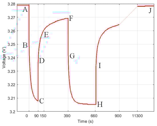 Step 3. The battery rests for 3 h before the pulse discharge, so the pulse discharge phase (A–C) can be treated as a zero-state step response. Thus, , ,  and  can be derived from Equations (8) and (9).