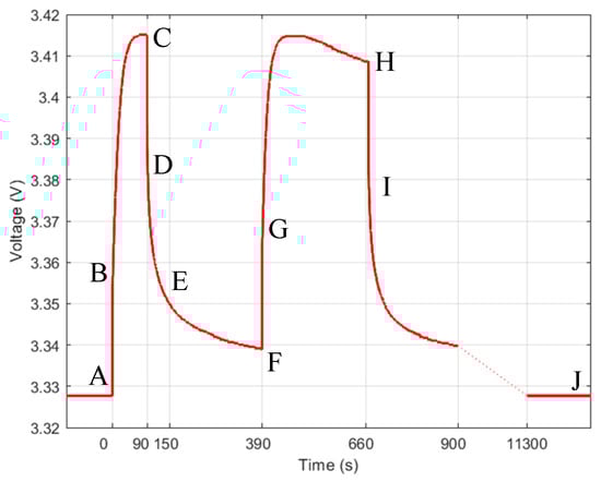 Figure 8 shows the battery terminal voltage variation curve for one cycle of the discharge phase of the modified HPPC test, where points A–J are the transition points for each work step (except for point E, which is the data point 1 min after point D). Taking the discharge stage as an example, the specific method for the offline parameter identification of the improved second-order RC model with the addition of a variable-time-constant RC links is as follows.