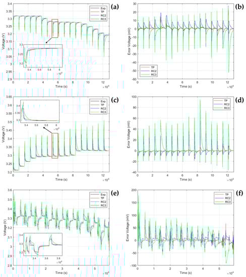 As can be observed in Figure 10a,c, for the second-order RC model and third-order RC model, the simulated voltages were bigger than the experimental value during charging and smaller during discharging. The reason for this was that, affected by the relaxation effect, the polarization resistance, identified based on the data at resting, was often bigger than the value when at charging/discharging because the percentage of slow-dynamic characteristics was high during resting but low during charging/discharging [].