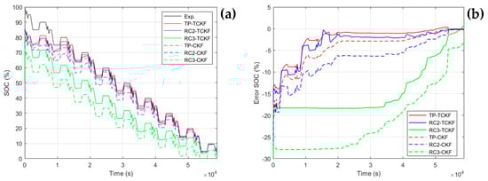 In performing the SOC estimation of an LFP battery, the state equation and output equation based on the TP model are shown as Equation (21). Since the polarization voltage  is a segmented function and the polarization inductance  branch current  is discontinuous, the polarization voltage  is just solved separately in each iteration as one term of the output equations in this paper.
