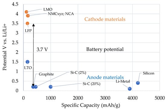 Overview of the electrode potentials and specific capacities of various active materials. Own representation based on [42,43].