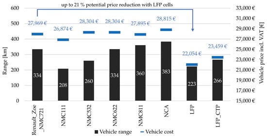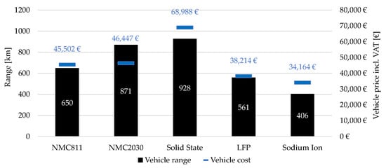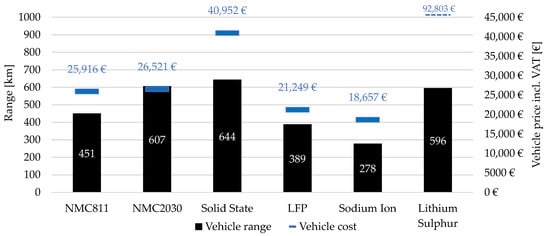 Comparison of the influence of different cell chemistries on thevehicle price and the calculated range of a vehicle in the medium vehicle segment.