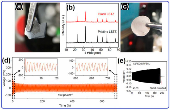 (a) LSTZ pellet after contacting the Li metal. (b) Comparative XRD patterns of pristine LSTZ and black LSTZ pellets. (c) PEO/LSTZ membrane retrieved from cycled symmetric lithium cell. Voltage–time profile of Li| |Li symmetric cell cycled at 100 μA cm−2 and 45 °C. (d) PEO/LSTZ. (e) PEO/LiTFSI. Reproduced with permission from Ref. [116]. Copyright 2019, National Academy of Sciences.