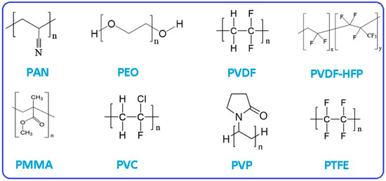 The fabrication of solid polymer electrolytes (SPEs) typically involves dissolving lithium salts, including Li bisfluorosulfonimide (LiFSI), Li bis(trifluoromethanesulfonyl)imide (LiTFSI), or Li trifluoropotassium sulfonate (LiCF3SO3), into various polymer hosts. Common polymer hosts employed in SPEs include poly(acrylonitrile) (PAN), poly(ethylene oxide) (PEO), poly(vinylidene fluoride), polyvinylidene fluoride–hexafluoropropylene (PVDF-HFP), poly(methyl methacrylate), poly(vinyl chloride) (PVC), poly(vinylpyrrolidone) (PVP), and poly(tetrafluoroethylene) (PTFE). Their chemical structures are provided in Figure 5.