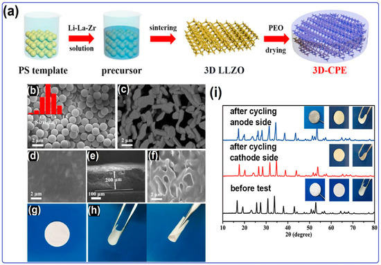 In the study by Ouyang et al. [181], high-shear garnet oxide electrolyte Li6.75La3Zr1.75Ta0.25O12 (LLZTO) and non-ionic and high polarity solid organic plastic crystalline succinonitrile (SN) formed a composite solid electrolyte. They mixed LiTFSI salt with poly(vinylidene fluoride-co-hexafluoropropylene) (PVDF-HFP), an attractive modified polymer with favorable electrochemical stability at ambient temperature, relatively poor crystallinity, and a high dielectric constant, which is used as an additive in electrolytes, providing thermal stability owing to its high boiling point and low vapor pressure properties. Thanks to the high polarity of SN, which proves to be able dissolve different salts including LiTFSI, the ionic conductivity of the CSE can increase up to 10−3 S cm−1 at room temperature. In addition to the mentioned properties of SN, it accelerates the passage of Li ions in the solid electrolyte by lowering the energy barrier. The ASSLOB prepared with the LLZTO-SN electrolyte showed low resistance at room temperature, a large discharge capacity (>9500 mAh g−1), high rate capability, and a stable long cycle life. Song et al. [177] produced a Li7La3Zr2O12 (LLZO) garnet filler within a polystyrene (PS) latex microsphere template. The polyethylene oxide (PEO) matrix was later incorporated into the structure, resulting in the formation of 3D and macroporous composite polymer electrolytes, as illustrated in Figure 8a. Figure 8b illustrates the well-defined spherical morphology of the PS particles, exhibiting an average diameter of 1.37 μm and a narrow size distribution. The SEM images in Figure 8c reveal the presence of three-dimensional (3D) LLZO grains with macropores that can accommodate the PEO matrix and prevent crystallization of the polymer. These LLZO grains exhibit a grain size ranging from 1 to 3 μm and possess a smooth surface, facilitating rapid ion transport through the continuous interfaces of the PEO matrix with the LLZO framework. The smooth and dense 3D composite polymer electrolyte, depicted in Figure 8d, exhibits a uniform surface without any voids. Furthermore, the cross-sectional view in Figure 8e indicates that the composite electrolyte has a thickness of approximately 200 μm. Figure 8f demonstrates the preservation of the 3D-LLZO structure within the PEO matrix, revealing the presence of pores that facilitate the transport of Li+ ions. The digital photographs depicted in Figure 8g and Figure 2h demonstrate the remarkable flexibility of the composite polymer electrolyte, exhibiting no indications of cracking or breaking, even when subjected to bending and folding. The 3D PEO-LLZO composite polymer electrolyte demonstrates remarkable stability, retaining its morphology and structure consistently, even after prolonged cycling. This exceptional stability safeguards both the anode and cathode, even under challenging reducing and oxidative conditions. The 3D LLZO networks obtained using PS template provide good interfacial and mechanical compatibility in PEO matrix structure while widening the ionic conduction path. The XRD graph presented in Figure 8i clearly illustrates that even after undergoing 50 cycles, the structures of both the anode and cathode components of the electrolyte remain intact, with no formation of impurities observed. These findings indicate the exceptional stability of the 3D composite polymer electrolyte when in contact with the reducing Li metal anode, effectively resisting the oxidative attack from active oxygen species and O2. The stability of the 3D CPEs meets the essential requirements with remarkable efficacy.